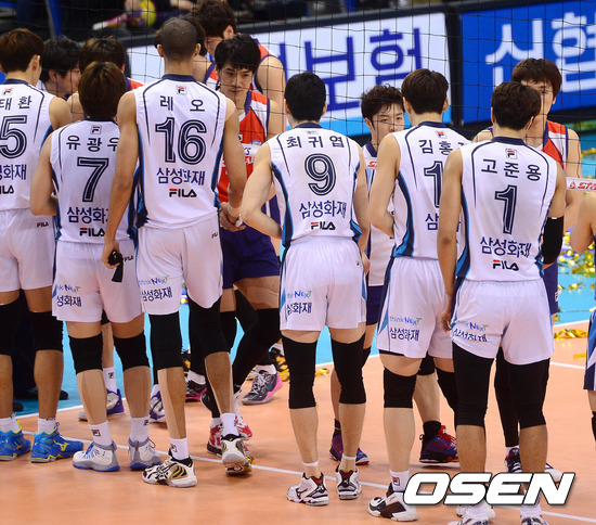 13일 오후 대전 충무체육관에서 열린 '2012-2013 NH농협 V-리그' 남자부 삼성화재와 대한항공의 경기 종료 후 선수들이 악수를 나누고 있다.