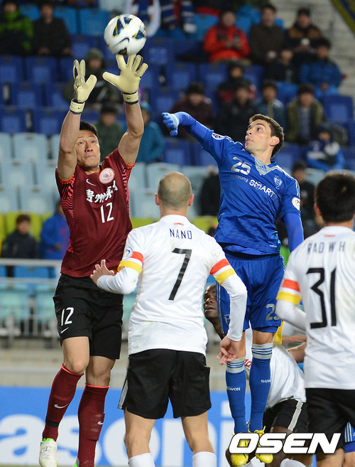 13일 오후 경기 수원월드컵경기장에서 열린 AFC 챔피언스리그(ACL) 조별 예선 H조 수원 삼성과 귀저우 런허(중국)의 경기, 후반 수원 핑팡이 귀저우 골키퍼와 공중볼을 다투고 있다
