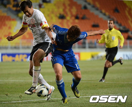 후반 수원 서정진이 귀저우 수비와 몸싸움을 펼치고 있다./soul1014@osen.co.kr