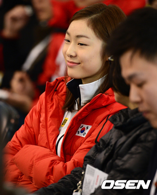 김연아가 추첨 결과를 바라보며 미소짓고 있다.