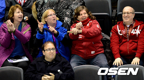 14일(한국시각) 오전 캐나다 온타리오주 런던 버드와이저 가든스에서 열린 2013 국제빙상경기연맹(ISU) 세계피겨선수권대회에서 경기장을 찾은 팬들이 정빙시간에 싸이 '강남스타일' 노래에 맞춰 춤을 추고 있다.
