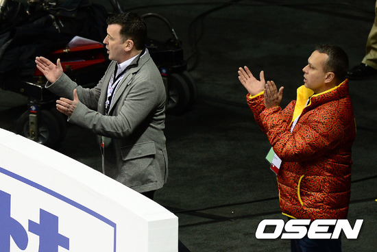 14일(한국시각) 오전 캐나다 온타리오주 런던 버드와이저 가든스에서 열린 2013 국제빙상경기연맹(ISU) 세계피겨선수권대회에서 브라이언 오서, 데이비드 윌슨 코치가 남자 싱글 유럽챔피언 하비에르 페르난데스의 쇼트 연기를 보며 박수를 치고 있다.
