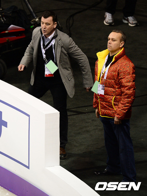 14일(한국시각) 오전 캐나다 온타리오주 런던 버드와이저 가든스에서 열린 2013 국제빙상경기연맹(ISU) 세계피겨선수권대회에서 브라이언 오서, 데이비드 윌슨 코치가 남자 싱글 유럽챔피언 하비에르 페르난데스의 쇼트 프로그램 연기를 바라보고 있다.