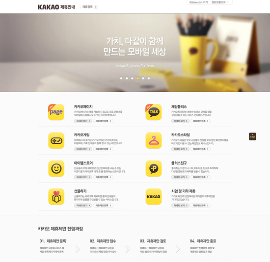 카카오는 7일, 플랫폼 사업 분야별로 급증하고 있는 외부 제휴 문의에 적극 대응하기 위한 공식 커뮤니케이션 창구로 카카오 비즈니스 제휴안내 사이트를 열었다고 14일 밝혔다.