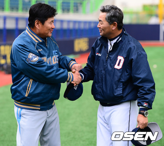 NC 박승호 코치가 두산 김진욱 감독이 경기 전 만나 악수를 나누고 있다.