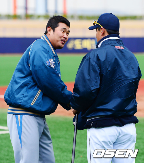 NC 이호준이 두산 김민재 코치를 찾아가 인사를 하고 있다.