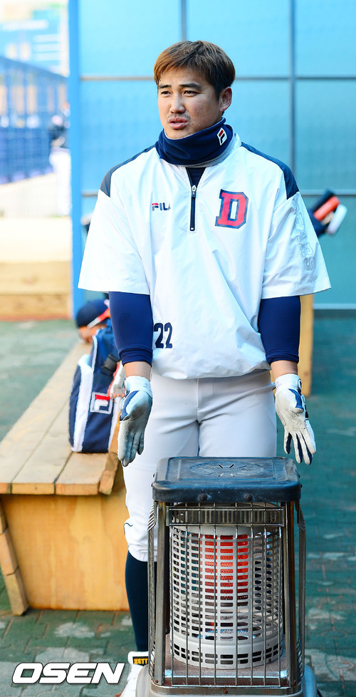 경기 전 두산 홍성흔이 난로 앞에서 추워하고 있다.