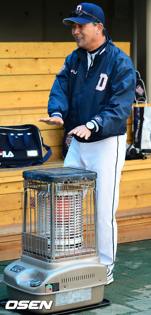 경기 전 두산 김진욱 감독이 난로에 손을 녹이고 있다.