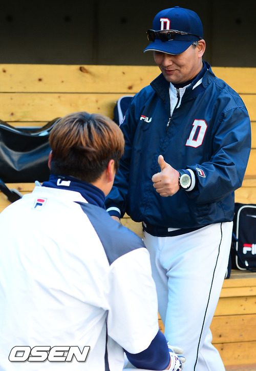 경기 전 두산 김진욱 감독이 홍성흔이게 최고라는 사인을 보내고 있다.