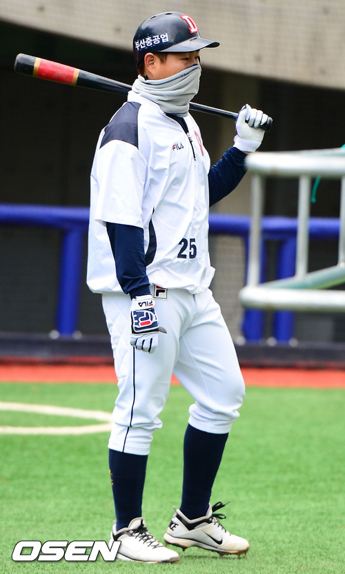 두산 양의지가 타격 연습을 기다리며 추위를 타고 있다.