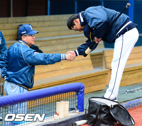두산 김민재 코치가 NC 김경문 감독에게 찾아가 인사와 악수를 나누고 있다.