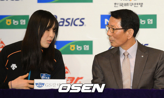 14일 오전 서울 청담 리베라 호텔 베르사이유홀에서 진행된 '2012-2013 V리그 포스트시즌 미디어데이'에서 GS칼텍스 정대영과 이선구 감독이 이야기를 나누고 있다.