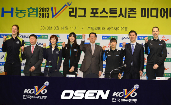 14일 오전 서울 청담 리베라 호텔 베르사이유홀에서 진행된 '2012-2013 V리그 포스트시즌 미디어데이'에서 현대건설 황현주 감독, 황연주, GS칼텍스 이선구 감독, 정대영, 베띠, IBK 기업은행 이정철감독, 이효희, 알레시아가 포토타임을 갖고 있다.