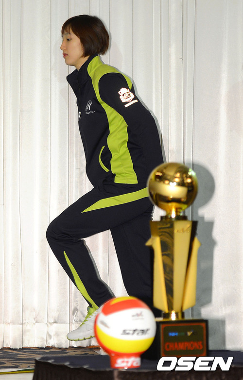 14일 오전 서울 청담 리베라 호텔 베르사이유홀에서 진행된 '2012-2013 V리그 포스트시즌 미디어데이'에서 현대건설 황연주가 무대로 오르고 있다.