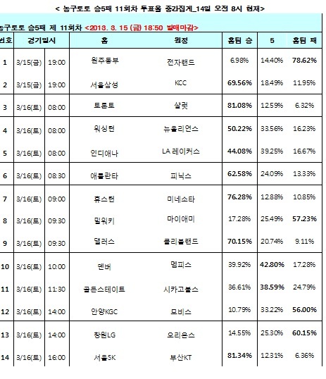 농구토토 승5패 11회차 투표율 중간 집계 결과