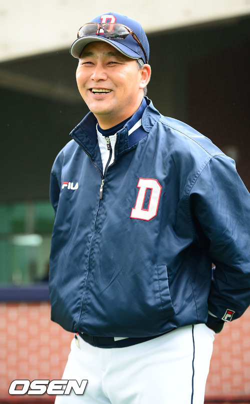 경기 전 훈련 중 두산 김진욱 감독이 환하게 미소짓고 있다.