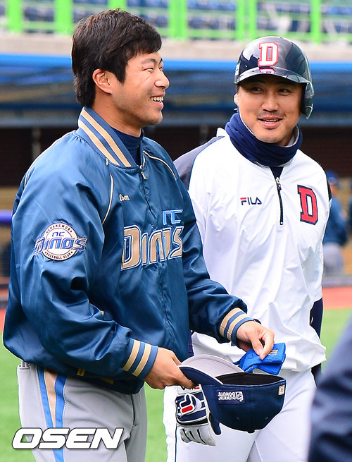 경기 전 훈련 중 두산 홍성흔과 NC 고창성이 악수를 나눈 후 즐겁게 얘기를 나누고 잇다.
