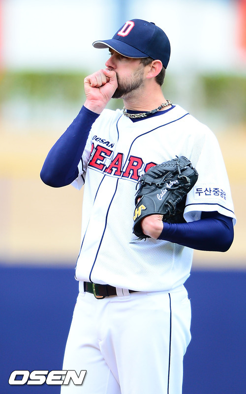 두산 선발 니퍼트가 입김으로 언 손을 녹이고 있다.