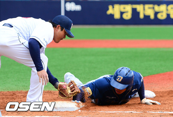 5회초 1사 주자 1루 NC 권희동 타석에서 두산 1루수 김동주가 1루 주자 모창민을 견재사 시키려 하고 있다.