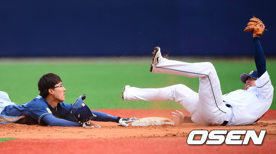 6회초 무사 주자 1,2루 NC 박민우 타석에서 두산 유격수 김재호가 2루 주자 노진혁을 견재사 시킨 후 넘어지고 있다.