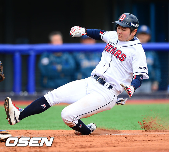 6회말 1사 주자 만루 두산 허경민의 중견수 희생플라이때 3루 주자 최주환이 홈으로 몸을 던지고 있다.