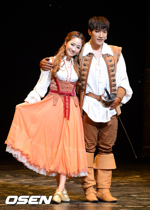 14일 오후 서울 충무아트홀 대극장에서 진행된 뮤지컬 '삼총사' 프레스콜에서 예은과 준케이가 포토타임을 갖고 있다.