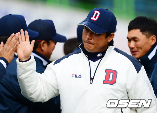 경기를 마치고 두산 김동주가 코치들과 하이파이브를 하고 있다. / rumi@osen.co.kr