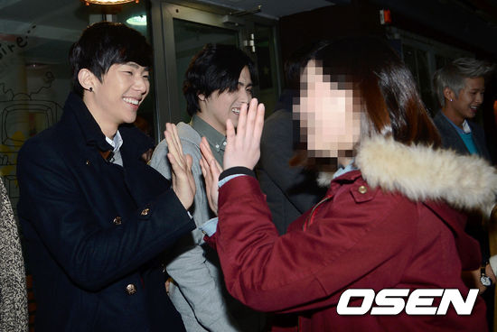제국의 아이들 케빈이 여성팬과 악수를 나누고 있다.