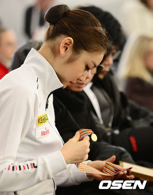 경기후 쇼트 1위를 차지한 김연아가 메달을 바라보고 있다./jpnews@osen.co.kr