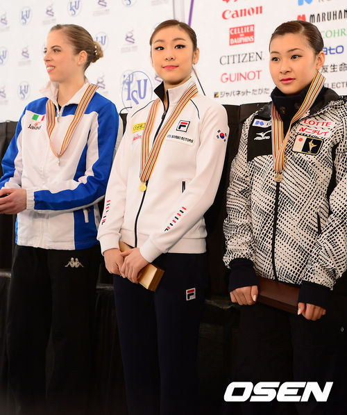 경기후 쇼트 1위를 차지한 김연아가 2위 코스트너 3위 카나코와 메달을 건네받고 포즈를 취하고있다./jpnews@osen.co.kr