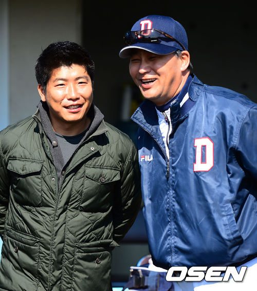경기 전 두산 김진욱 감독과 박재홍 해설위원이 즐겁게 얘기를 나누고 있다.