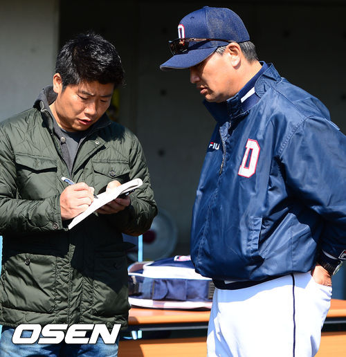 경기 전 두산 박재홍 해설위원이 김진욱 감독을 취재하고 있다.