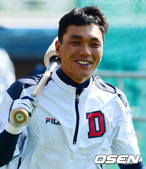 경기 전 두산 이종욱이 타격훈련을 기다리며 환하게 웃고 있다.