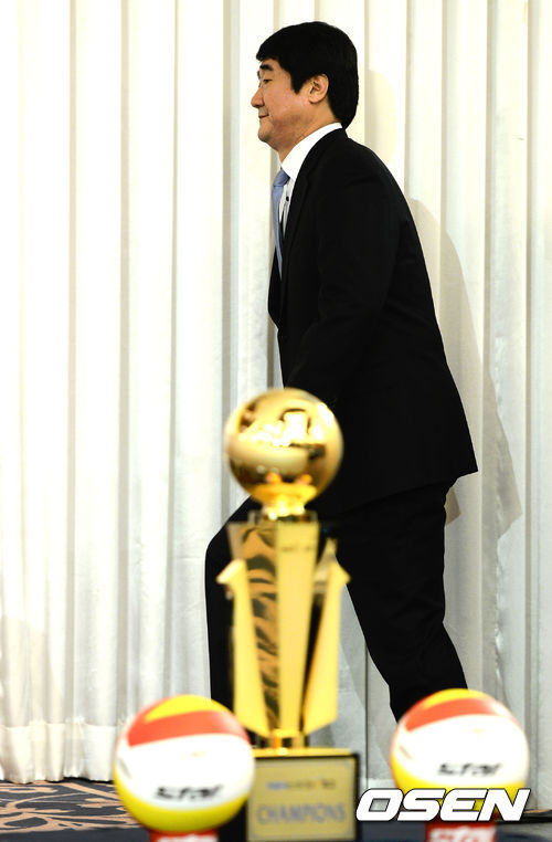 15일 오전 서울 청담동 호텔리베라 베르사유홀에서 열린 2012-2013 NH농협 V리그 포스트시즌 미디어데이에서 삼성화재 신치용 감독이 무대를 오르고 있다.