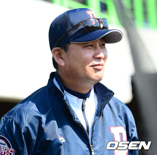 경기 전 두산 김진욱 감독의 선수들의 훈련을 바라보며 미소짓고 있다.