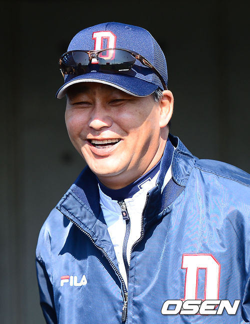경기 전 두산 김진욱 감독이 환하게 웃고 있다.