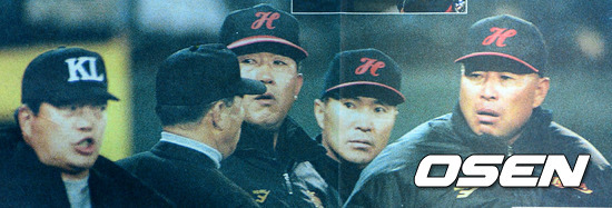 해태 덕아웃에서 지켜보고 있던 김응룡 감독이 양손을 허리춤에 끼고 ‘코끼리 걸음’으로 문승훈 구심을 향해서 나왔다. 해태 코치들도 달려왔다.