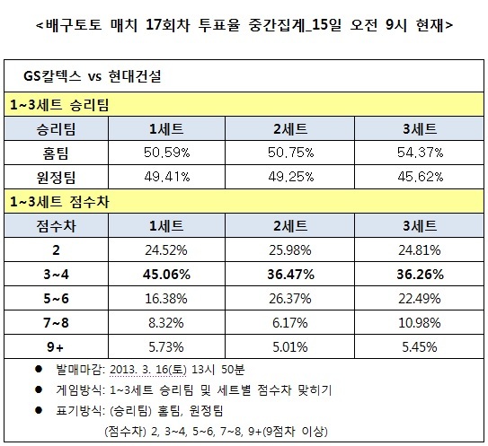 국민체육진흥공단(www.kspo.or.kr)이 발행하는 체육진흥투표권 수탁사업자인 스포츠토토의 공식 온라인 발매사이트 베트맨(www.betman.co.kr)은 오는 16일 오후 2시 구미박정희체육관에서 펼쳐지는 GS칼텍스와 현대건설의 플레이오프 첫 경기를 대상으로 하는 배구토토 매치 17회차 게임 투표율 중간집계 결과, 배구팬들은 리그 2위를 차지한 GS칼텍스(21승9패)와 3위 현대건설(16승14패)의 투표율이 거의 비슷하게 나와 한치의 양보도 없는 박빙승부를 예고했다고 밝혔다.