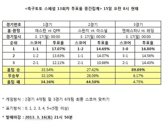 [축구토토] 국민체육진흥공단(www.kspo.or.kr)이 발행하는 체육진흥투표권 수탁사업자인 스포츠토토 공식 온라인 발매 사이트인 베트맨(www.betman.co.kr)은 오는 17일에 펼쳐지는 애스턴-QPR(1경기), 스완지시티-아스널(2경기), 맨체스터유나이티드-레딩(3경기)전 등 잉글랜드 프리미어리그 3경기를 대상으로 한 축구토토 스페셜 13회차 투표율 중간집계 결과, 축구팬 89.09%가 3경기에서 맨체스터유나이티드(이하 맨유)가 레딩을 상대로 완승을 거둘 것으로 예상했다고 밝혔다.
