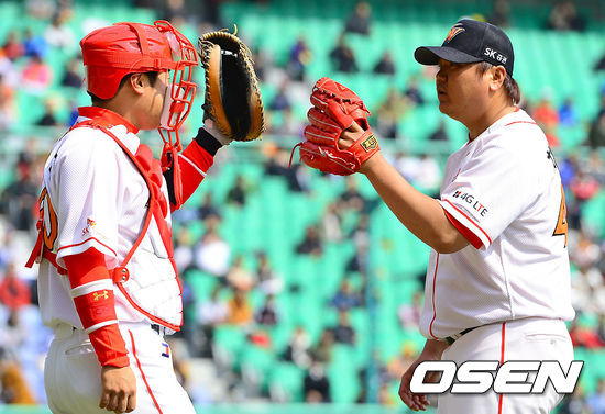 15일 오후 인천 문학구장에서 열린 ‘2013 한국야쿠르트 세븐 프로야구’SK 와이번스와 LG 트윈스의 시범경기,4회초 이닝 종료 후 SK 채병용 선발투수와 김정훈 포수가 하이파이브를 하며 더그아웃으로 들어가고 있다