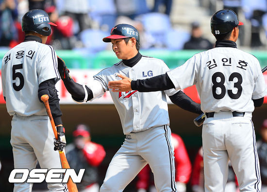 15일 오후 인천 문학구장에서 열린 ‘2013 한국야쿠르트 세븐 프로야구’SK 와이번스와 LG 트윈스의 시범경기, 5회초 1사 1루 LG 오지환이 선취 2점 홈런을 날리고 동료들과 하이파이브를 하고 있다