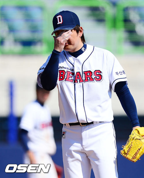 4회초 1사 주자 3루 NC 이현곤 타석에서 두산 선발 김선우가 땀을 닦고 있다.