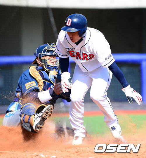 5회말 무사 주자 2,3루 두산 고영민의 1루수 앞 땅볼때 3루 주자 손시헌이 홈에서 NC 허준 포수에게 태그아웃 당하고 있다.