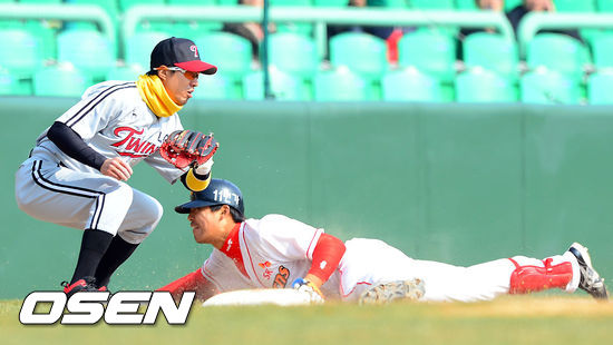 15일 오후 인천 문학구장에서 열린 ‘2013 한국야쿠르트 세븐 프로야구’SK 와이번스와 LG 트윈스의 시범경기, 7회말 1사 1,2루 SK 한동민이 2타점 적시타를 날리고 3루에 세이프 되고 있다.