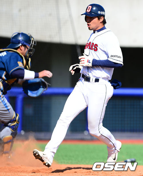 5회말 1사 주자 만루 두산 허경민의 좌익수 앞 2타점 적시타 때 오재원이 홈을 밟고 있다.