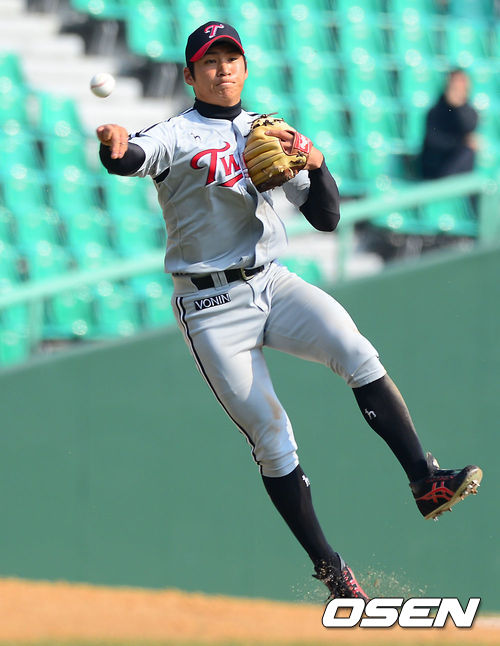 15일 오후 인천 문학구장에서 열린 ‘2013 한국야쿠르트 세븐 프로야구’SK 와이번스와 LG 트윈스의 시범경기, 8회말 LG 오지환 유격수가 SK 선두타자 김강민의 안타성 타구를 잡아 송구하고 있다