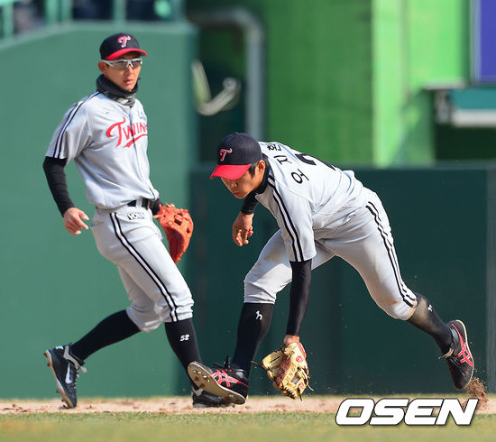15일 오후 인천 문학구장에서 열린 ‘2013 한국야쿠르트 세븐 프로야구’SK 와이번스와 LG 트윈스의 시범경기, 8회말 LG 오지환 유격수가 SK 선두타자 김강민의 안타성 타구를 잡아 송구하고 있다. 오지환은 5회초 선취 2점 홈런을 기록했다.