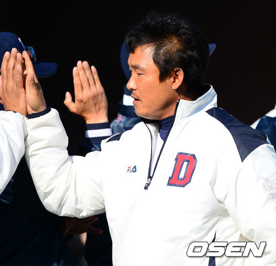 경기를 마치고 두산 김동주가 코치들과 하이파이브를 하고 있다. / rumi@osen.co.kr