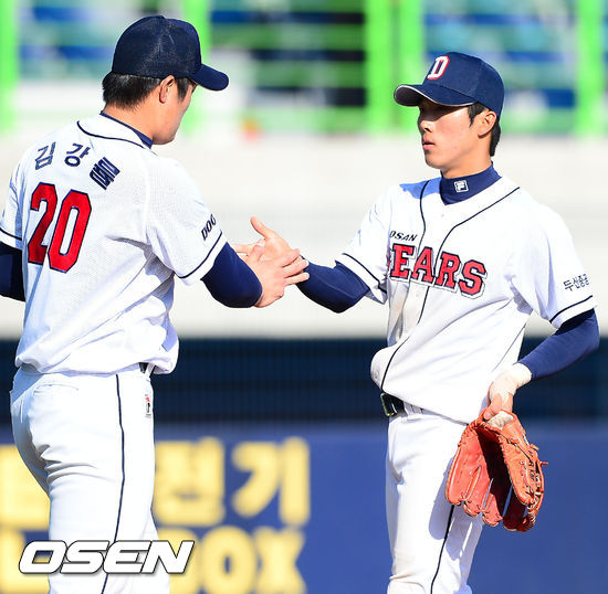 경기를 마치고 두산 허경민이 김강률과 하이파이브를 하고 있다. / rumi@osen.co.kr