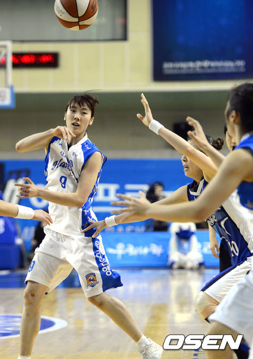 15일 오후 춘천호반체육관에서 열린 '2012-2013 KDB금융그룹 여자프로농구 챔피언 결정전' 1쿼터 우리은행 박혜진 삼성생명 수비를 피해 패스를 시도하고 있다.